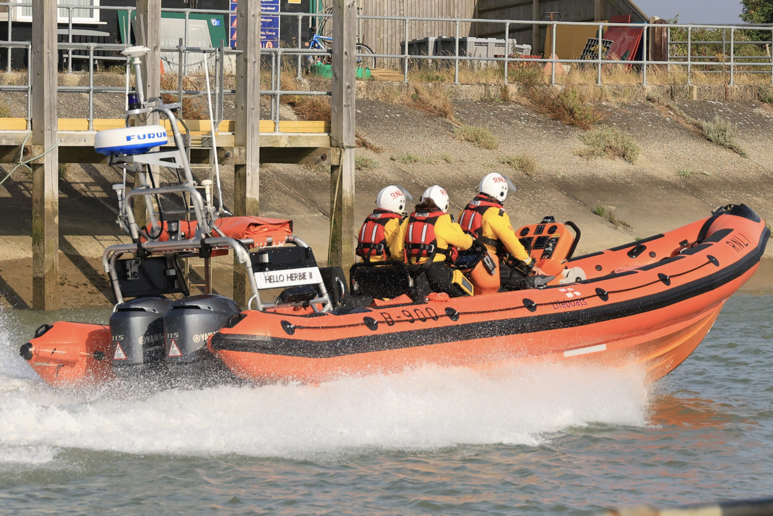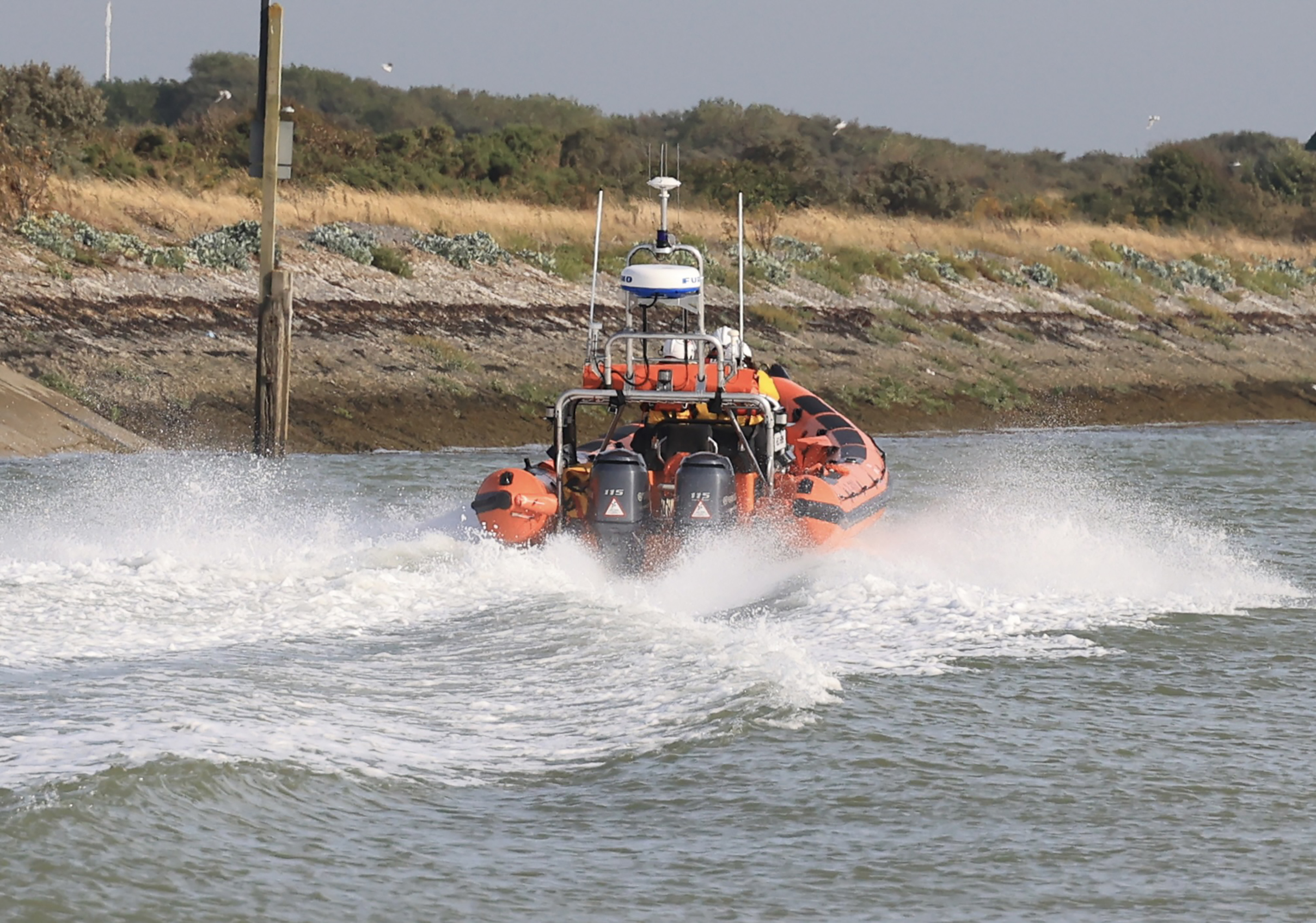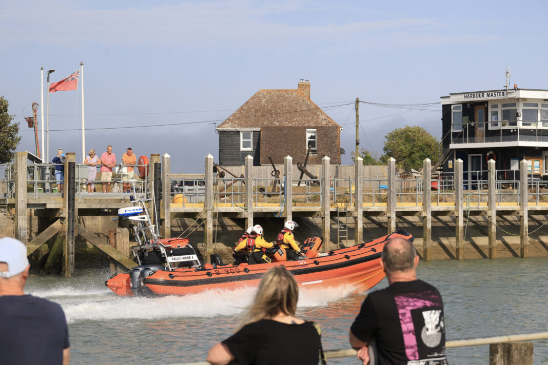 RNLI Rye Harbour boat launching.”Out on a shout”
