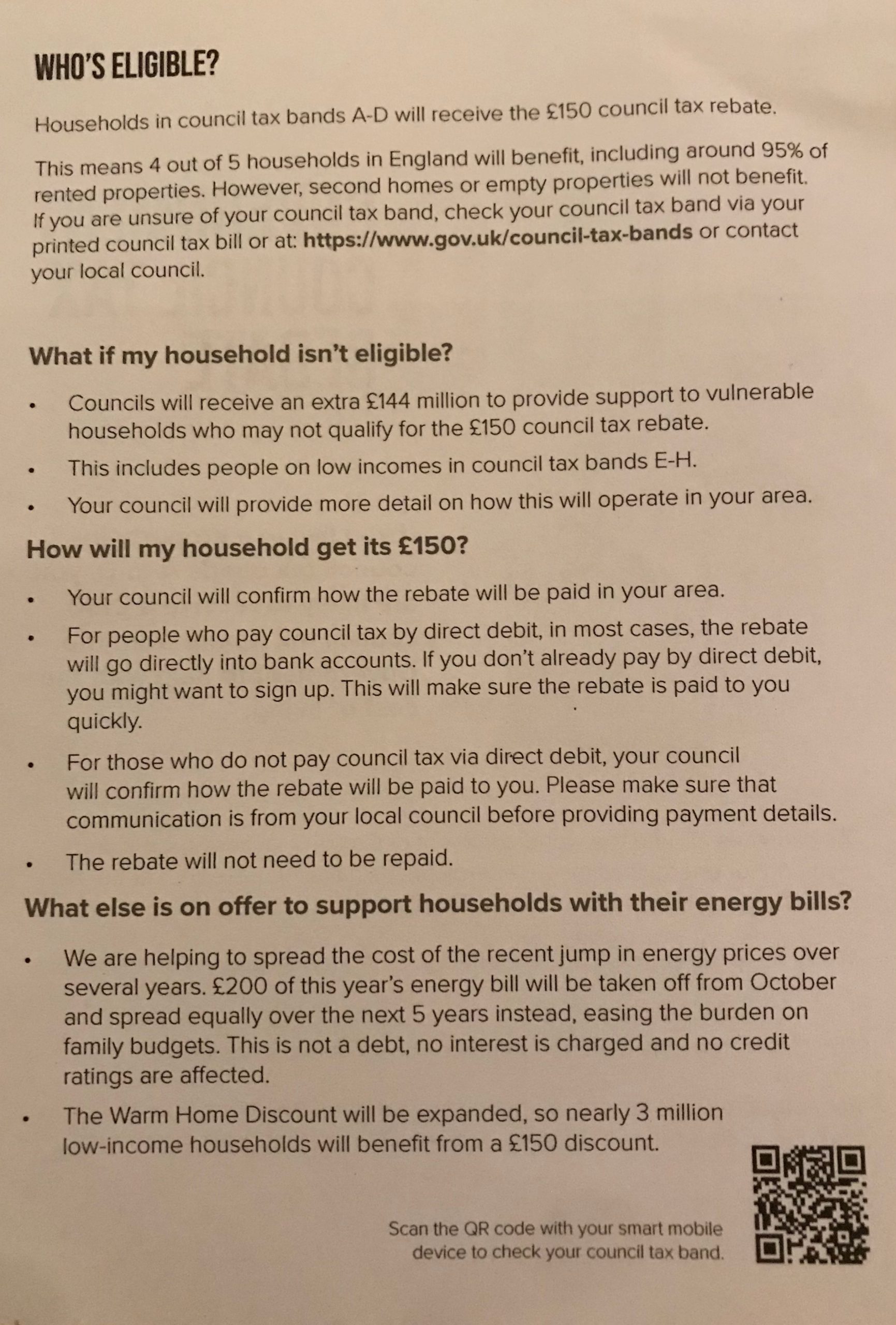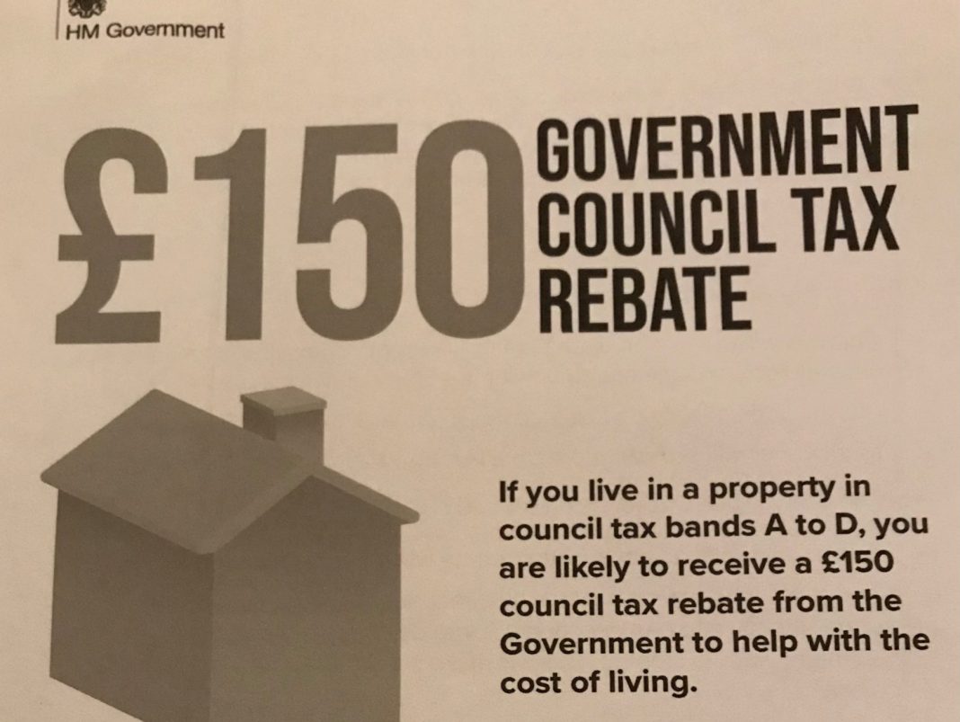 I received the above through my letterbox yesterday informing me that if my property falls into council tax bands A to D I am likely to receive a rebate of £150 from the government, to help with the cost of living.