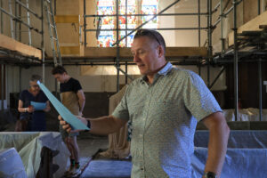 Since May, the builders have removed all the plaster on the west window wall and a large part of the nave. The new plaster must be applied in three stages, with weeks in between to allow each coat to dry out. The walls will then be repainted. Re-pinning repairs around the window have also been carried out. It is also planned to replace the 40-year-old lighting in the nave and chancel with LED lights to be compliant with CofE regulations and to be more environmentally friendly and easier to maintain. This will happen once the painting has been completed.