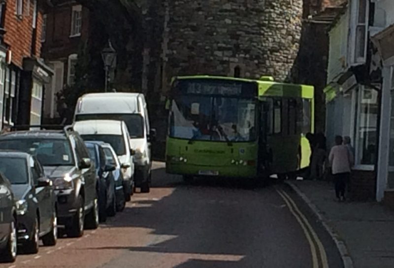 Seen by chance in Landgate this week: a white van illegally parked is preventing the bus from turning the ninety-degree bend from Tower Street into Landgate. The bus managed it eventually but at the expense of some damage to the vehicle and the partial demolition of a bollard (just visible to the right of the bus). In the meantime the road was impassable to all other traffic and the inevitable queues built up stretching back down Cinque Ports Street towards Station Approach.