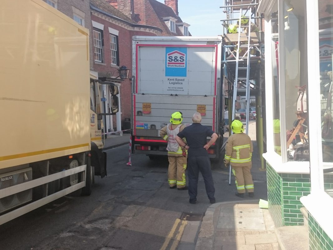 The stationary lorry, now supporting the scaffolding, was unable to move and was left blocking part of the road at the junction with Market Road.