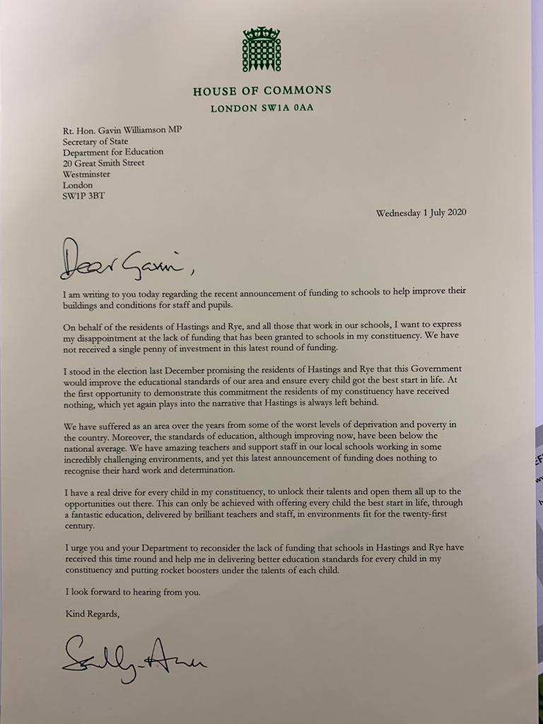 “However, I am deeply disappointed that Hastings and Rye has missed out on this vital funding. That is why I am urging the education secretary to reconsider his decision and to provide schools and children in this constituency with the funding they deserve. I have written to him urging him to think again.”