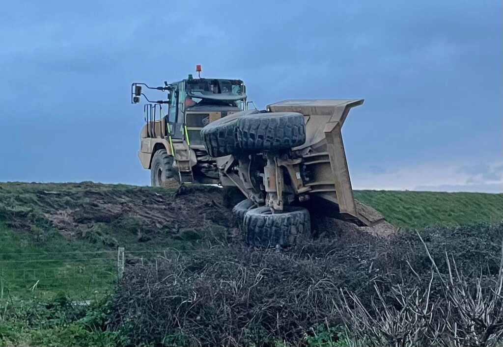 A fellow walker, Penny Downes, witnessed the incident. “A line of lorries was heading towards Pett Level and this one at the back of the line must have got too close to the edge of the sea wall as he came round the bend. A wheel came over the edge of the bank then the whole thing started to tip really quite slowly pulling the cab around.