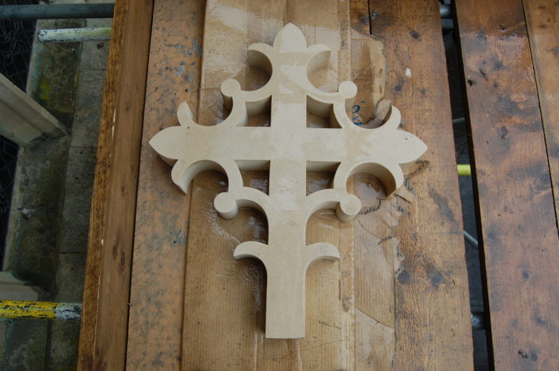The stone cross on the east end gable of St Mary’s church fell to the ground during the gales just before Christmas 2013.  It is being replaced by one newly sculptured by local stonemasons Elliott Brotherton, based at Broad Oak, near Rye. The picture of the cross lying on scaffold boards high up outside the east window shows the detailed artistry of the work undertaken by this firm, although these days of course it was not carved by hand. The design had to be derived from photographs of the former cross, because when it fell it shattered into many pieces and was impossible to re-assemble. “It was so badly eroded, it was a wonder it hadn’t fallen before”, said John Gurney, church surveyor to St Mary’s.
