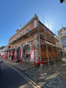 Work is taking place at the town hall in Rye, with scaffolding surrounding the building.