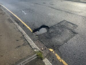 Our picture shows the pothole at the bottom of Udimore Road as you head into Rye – just one of hundreds on local roads made worse by recent rain.