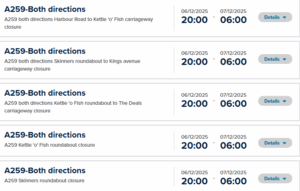 National Highways highlights work at the Kettle ‘o Fish and Skinners roundabouts in several different listings, along with New Road and parts of Winchelsea Road.