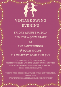 Come along to the vintage swing evening to help raise funds for Rye Lawn Tennis Club on Friday, August 9 at 6:30pm. The ticket cost includes five-piece band Loulou Swing, delicious barbecue, Lindy Hop lessons and demos and legendary local DJ Gypsy John.
