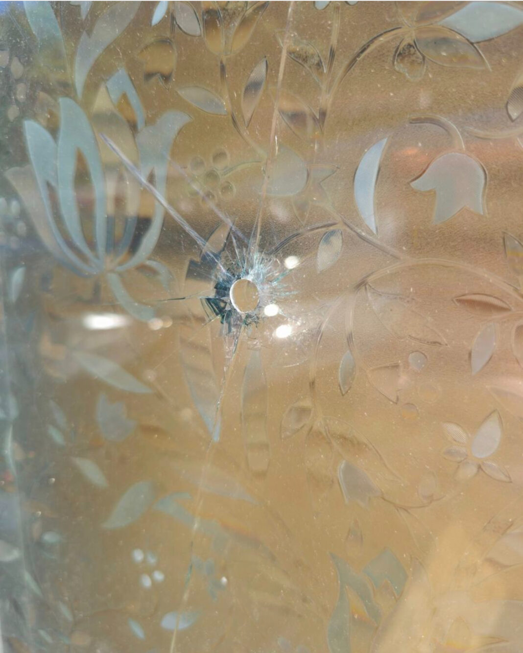 Louisa Jennings says the damage to her front window was caused by a 9mm steel ball bearing. “I was shocked. It sounded like a gun shot. It’s left a hole in the outside glass but luckily didn’t get through the second pane. If it had and had hit someone it could have been far worse. It’s £500 to repair and we can’t afford that now.”
