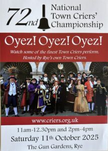 It’s the National Town Criers Championships in Rye this Saturday, October 11. 21 competitors are confirmed, including 4 from abroad. Contestants will have to make two cries – one about their home town with a second on the subject of peace. There’s also a chance for the public to take part.