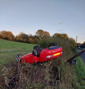 Sussex Police are investigating after a car hit a telegraph pole and rolled over on Whitebread Lane near Northiam on Saturday afternoon October 25.