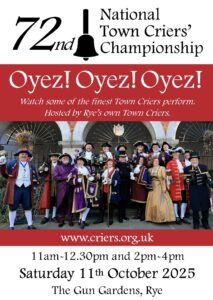 Rye’s Town Crier Paul Goring says he is delighted the town is hosting the championships for the third year in a row. “The competition has been running almost continually since 1914. My fellow criers love coming to Rye and always comment on the warm welcome that our town gives them. My thanks to Rye Town Council – and the other generous sponsors – for their support of this National Championships.”