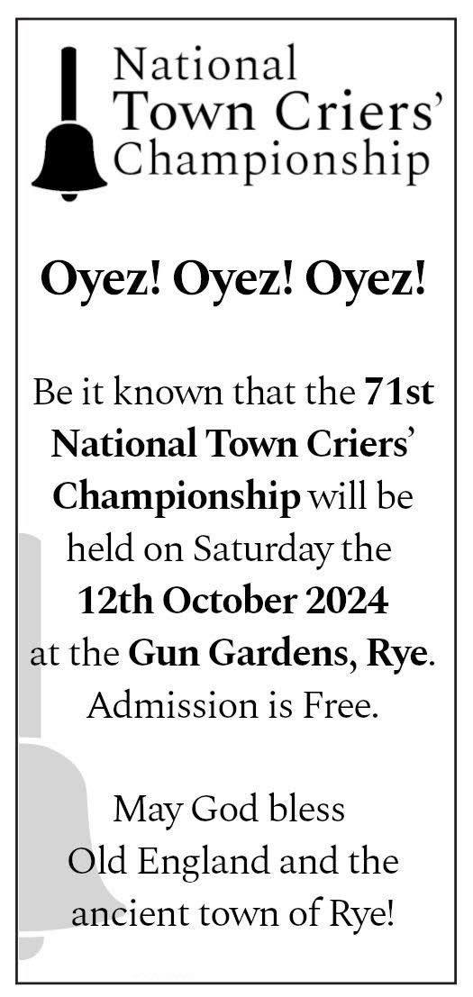 After the amazing success of last year’s contest, the National Town Criers’ Championships will be held in Rye on Saturday October 12 in the Gun Gardens.