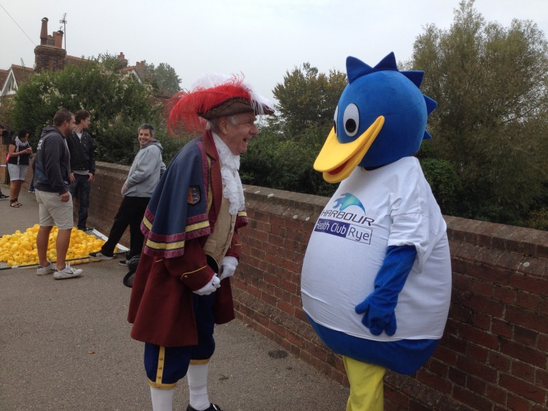 They’re off in a blur of yellow. It was the annual duck race last weekend from Ferry Road bridge to raise money for the nearby Rye pre-school playgroup – along with other attractions. Town Crier Rex Swain was there to see them off, but he was busy quacking away to a rather larger duck from the Health Club.