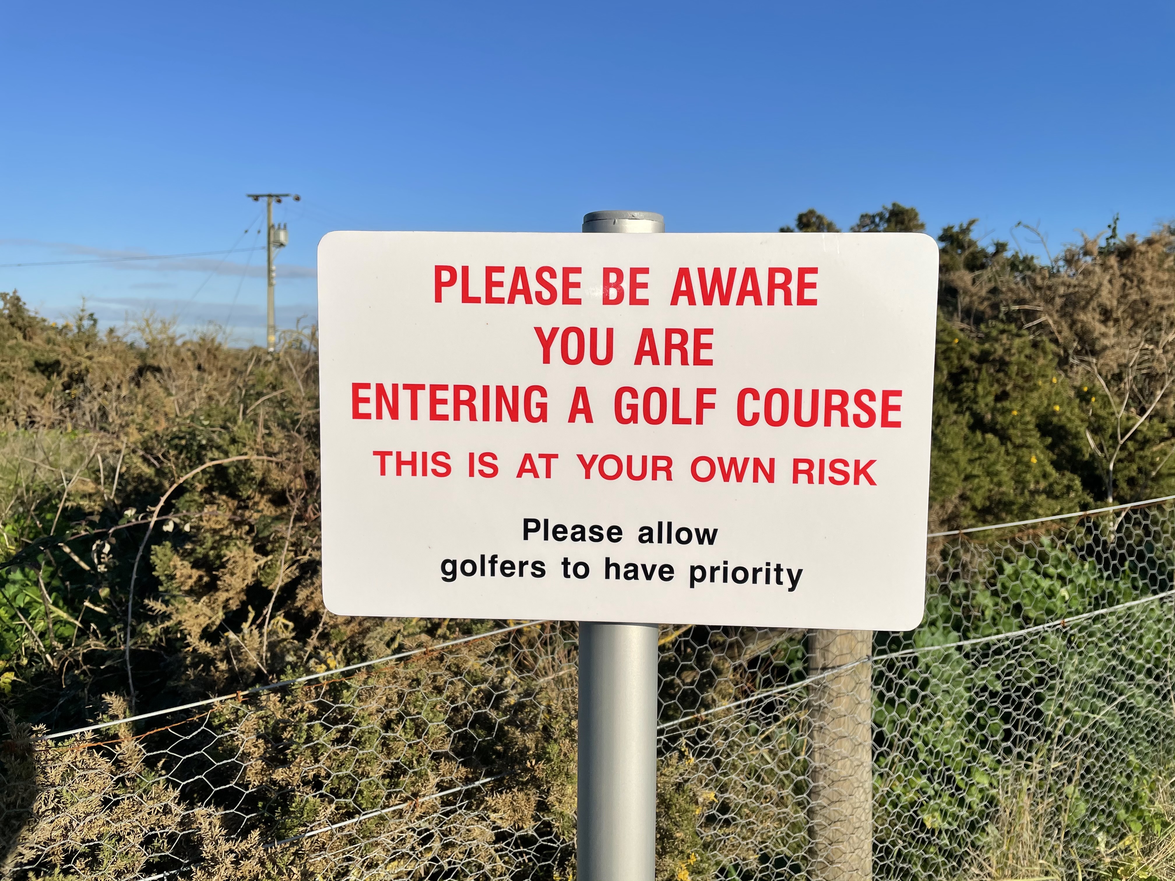 Only this morning at 07-55 a dog Walker was walking on the 6th fairway on the old course not with one dog or two dogs but five dogs running everywhere’s unbelievable, had we been 5 minutes earlier a dog or or the woman dog Walker could have been struck with a golf ball travelling at a very fast speed, absolutely stupid for her to do that, just off the side of the 6th fairway are 2 safety Posts one either side you press a button and that’s connected to a remote green light which tells you can drive from the 6th tee safely.being out on the golf course first with nobody in front of us we therefore could drive off knowing that nobody was on the fairway as I said 5 minutes earlier then we could have driven our golf balls straight into them causing a serious injury. So please keep to the public footpath