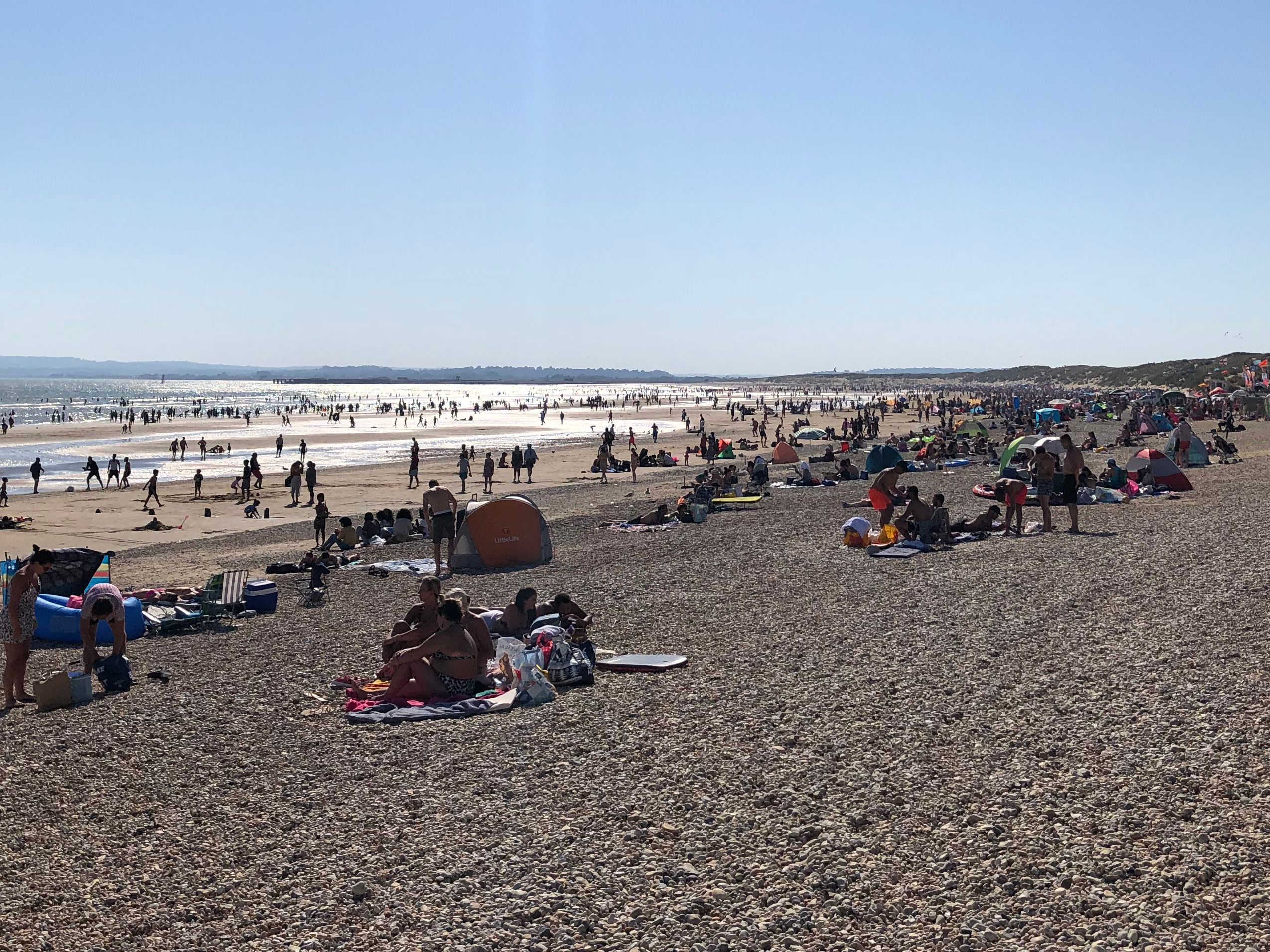 Camber Sands on Wednesday at very low tide. But high tide comes right up to the edge of the stones squeezing people much closer together.