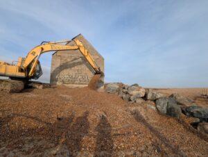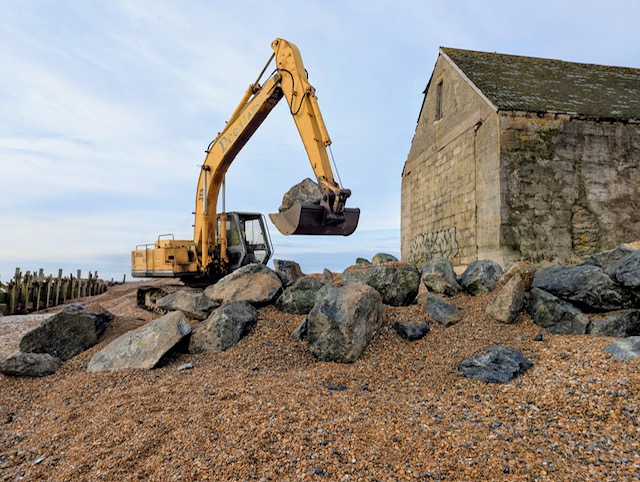 The latest work has seen the new groyne extended in length and height. A farm excavator has also moved more shingle into place to shield the building from the tide..