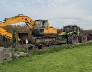 Excavator moving shingle as protective barrier in front of the lifeboat house