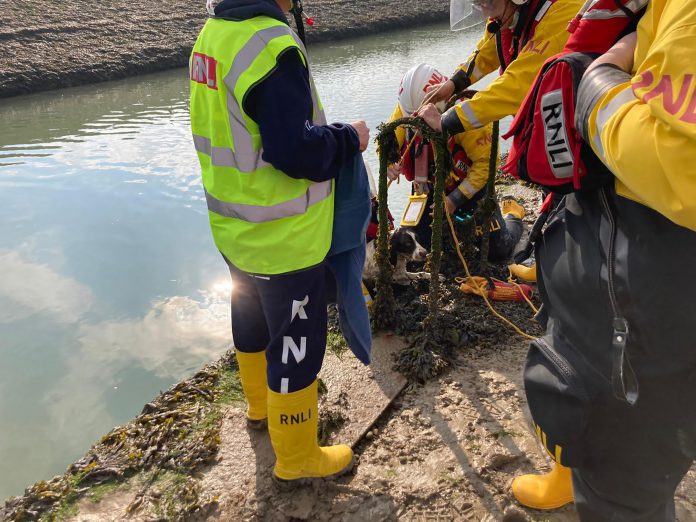RNLI Rye Harbour was tasked by the coastguard at 8:21am and, because there was not enough water to launch the Atlantic 85, crew members made their way on foot to the place where Luna had gone in to the river – and Rob Jennings went into the river, rescued Luna, and brought her to safety on the river bank.