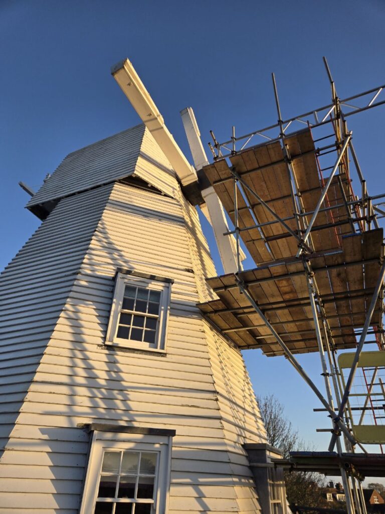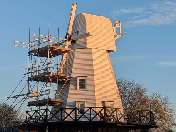 surviving mill in Rye, Rye Windmill. It is a Grade II listed smock style windmill, the common build in Sussex alongside older post mills. It was rebuilt in 1932 after a fire in the baker’s oven destroyed all but its brick base overnight on Friday 13 June 1930.