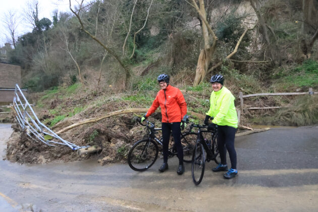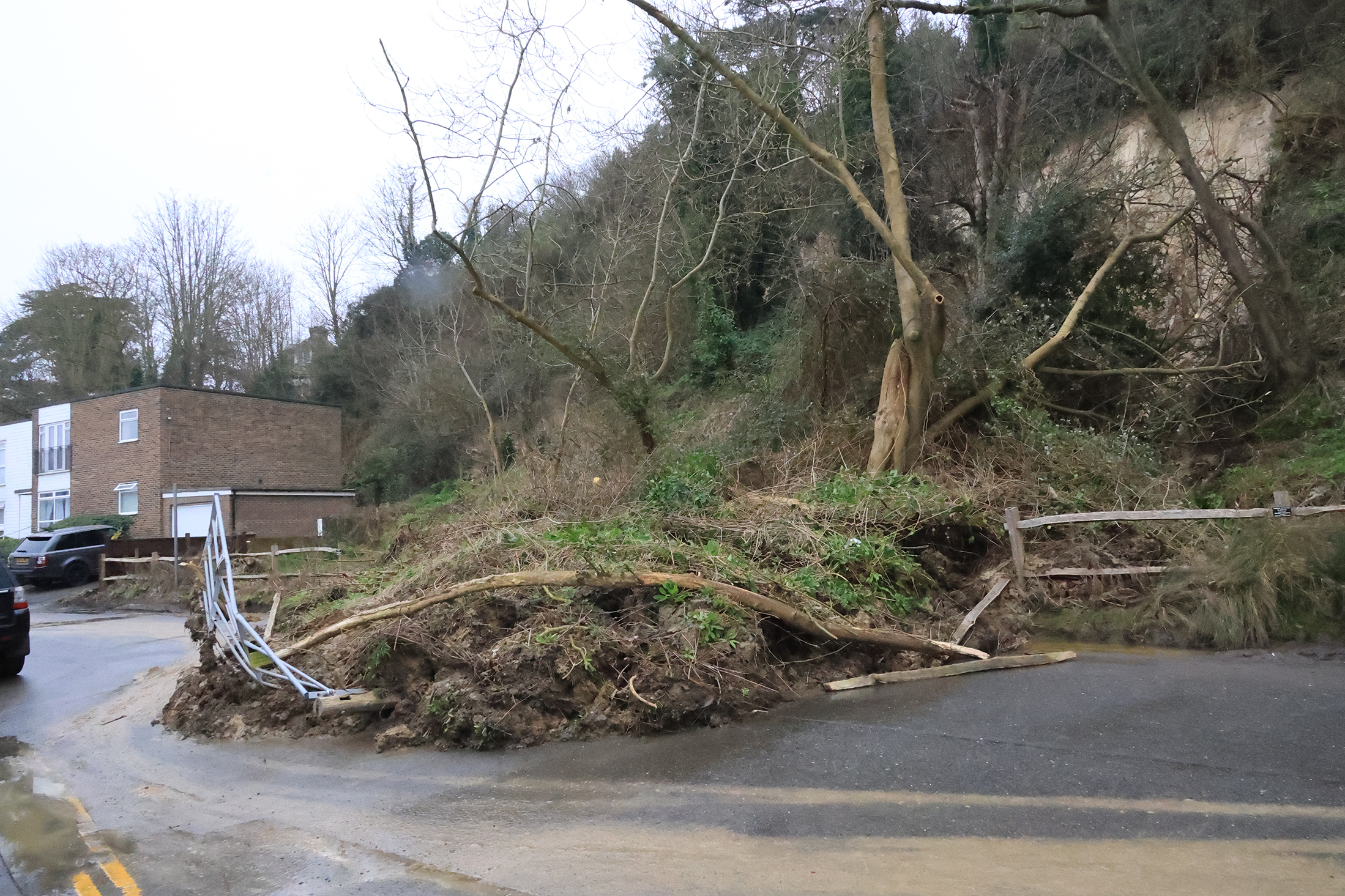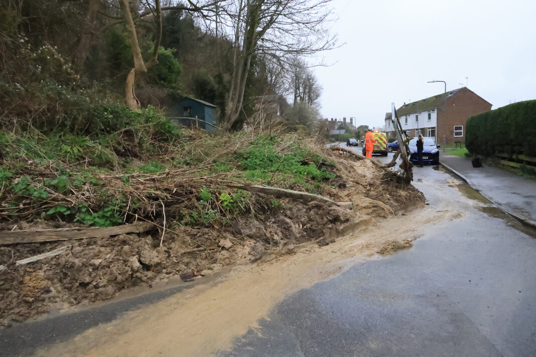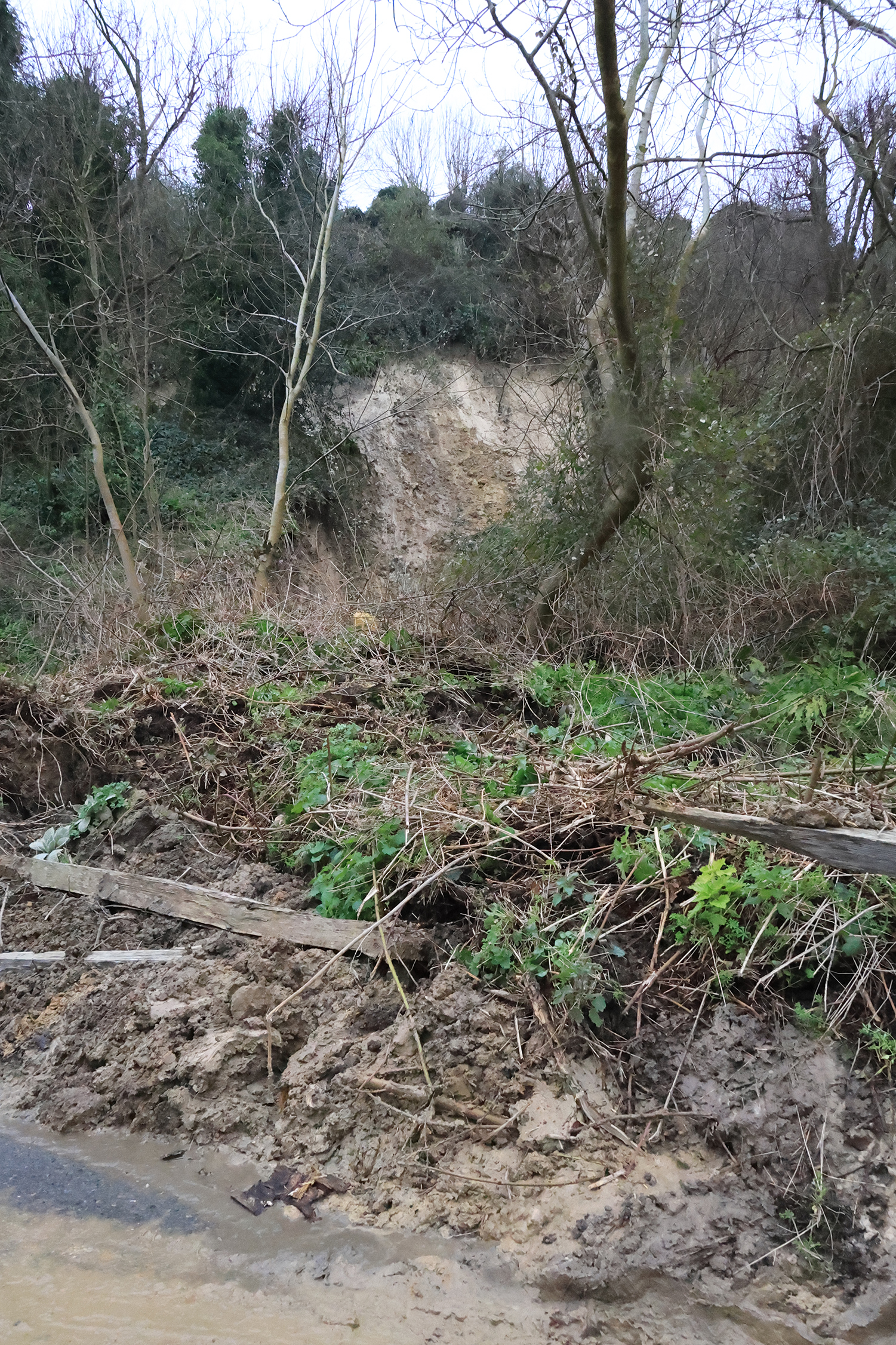 Also a smaller landslip which blocked Dumbwomans Lane yesterday. Volume of rainfall plus natural springs plus very few living/rooted trees remaining in the very steep bank. Our thanks to local farmer for clearing the mud/debris.