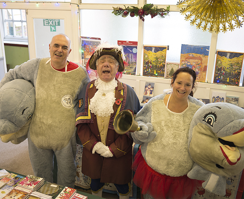 Rye Town Crier Rex Swain was in fine voice as he launched the opening of the charity Christmas card shop for the 2015 season last Saturday (October 31). Dolly and Dillon, dolphins from The Oliver Curd Trust, waddled the streets with him to spread the news and clearly got the message across as the shop sold more packs of cards than on the same opening day last year.