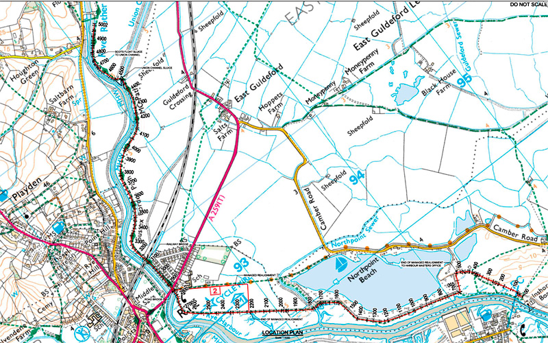 The agency says that the intention is to “hold the line by improving and realigning the earth walls to improve the standard of protection. This would upgrade defences to combat long-term sea-level rise.” The bank to be realigned is a short section of the defences immediately south of the A259 on the east bank (click on map below to enlarge view). The existing curving bank, much loved by dog walkers and others making their way towards Camber, will be realigned east to run straight south along the footpath close to the former Freda Gardham School fence, before bending back towards the Rother.