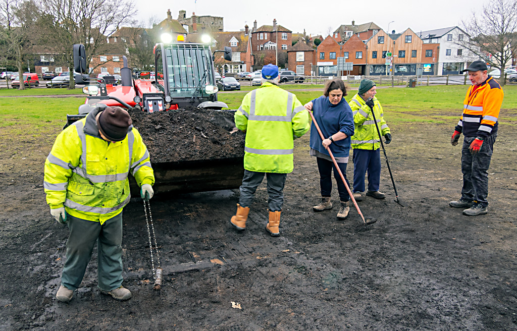 A working party from the Rye Bonfire Society was finally able to to clear the remnants of the bonfire on the Salts. Although normally the bonfire site can be cleared within a week when weather permits, Rye residents will be aware of the continuous wet weather conditions this winter; this weekend was the first time a machine could be got onto the Salts to clear. Reseeding will take place as soon as possible.