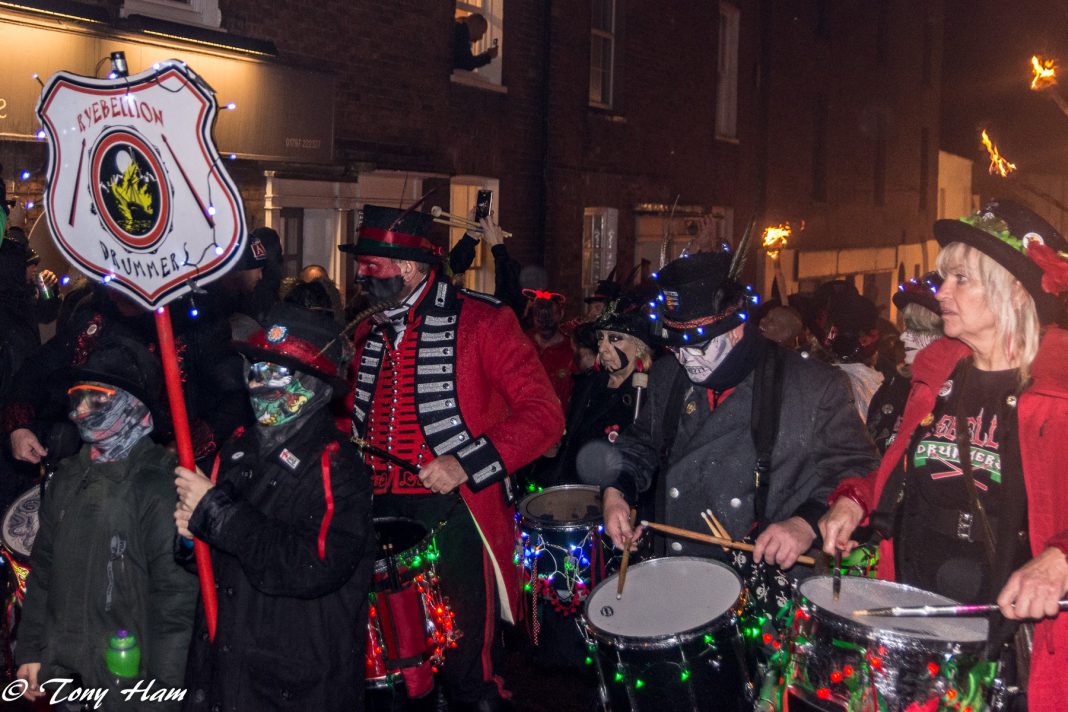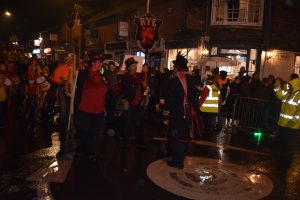 Despite the appalling weather – the clouds opened just as the parade was due to start – and restrictions on some public transport the usual massive crowds gathered to watch the bonfire societies process through the town and on to the Salts.