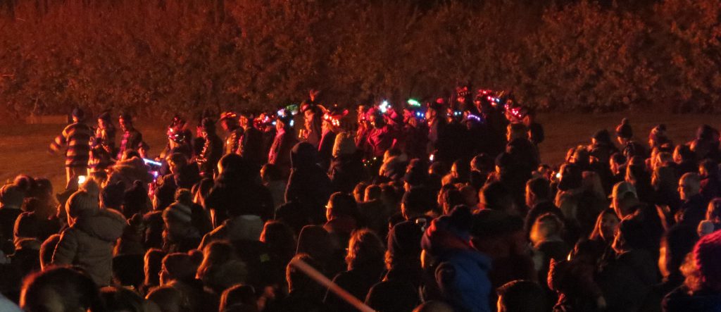 After processing along the main road, the colourful group made a grand entrance onto the main field behind the Robin Hood, accompanied by the throb of drums and anticipation of the lighting of the bonfire.
