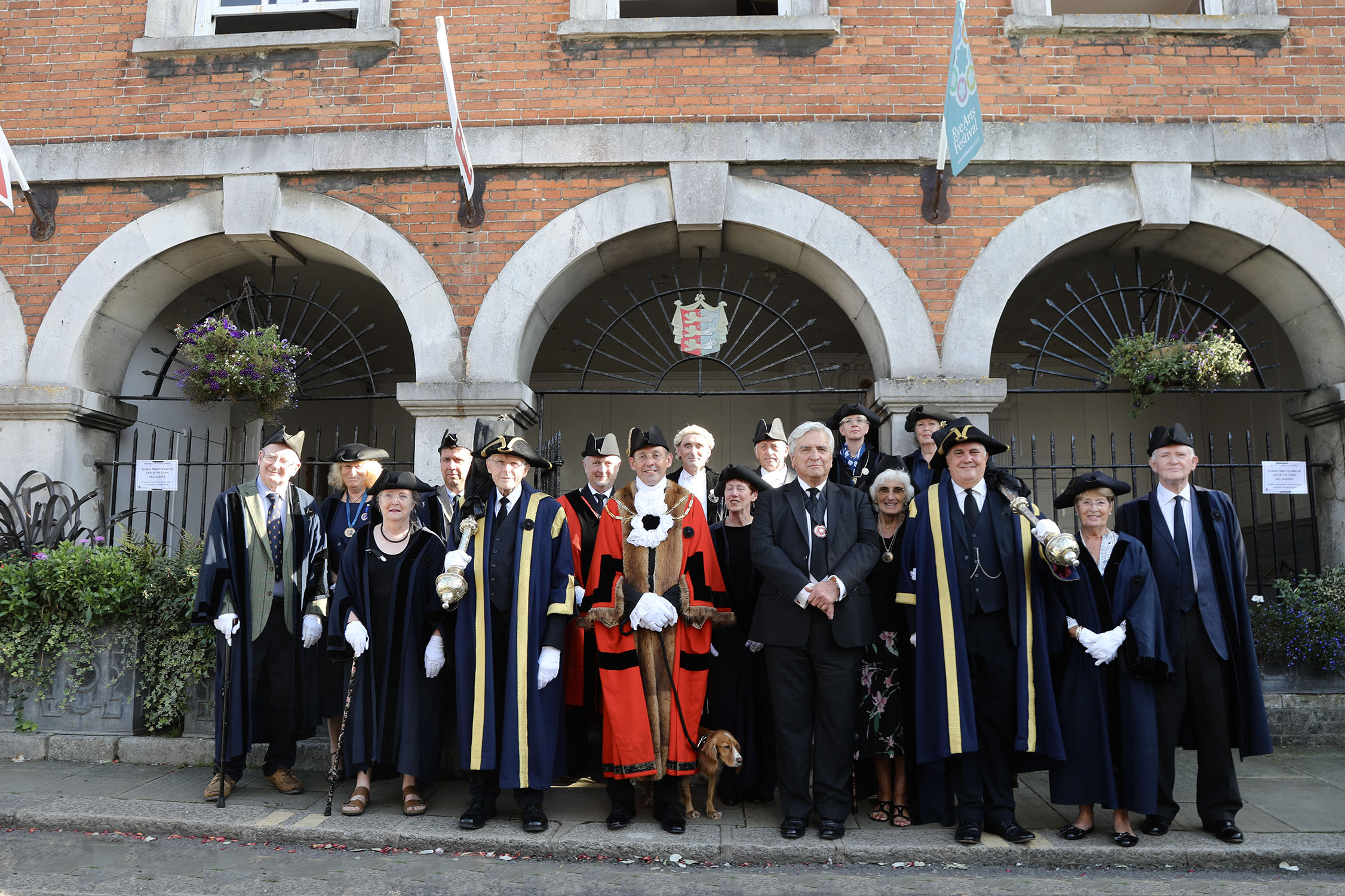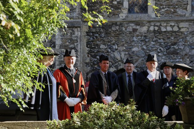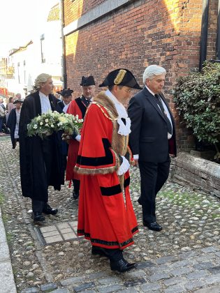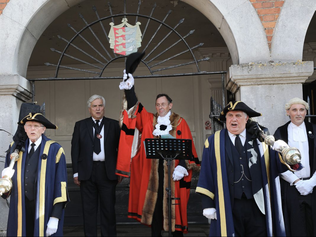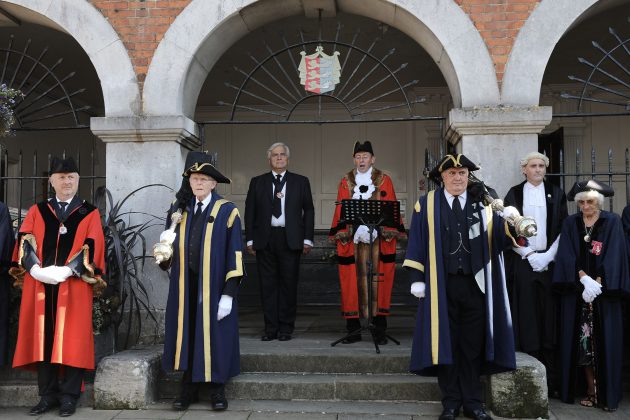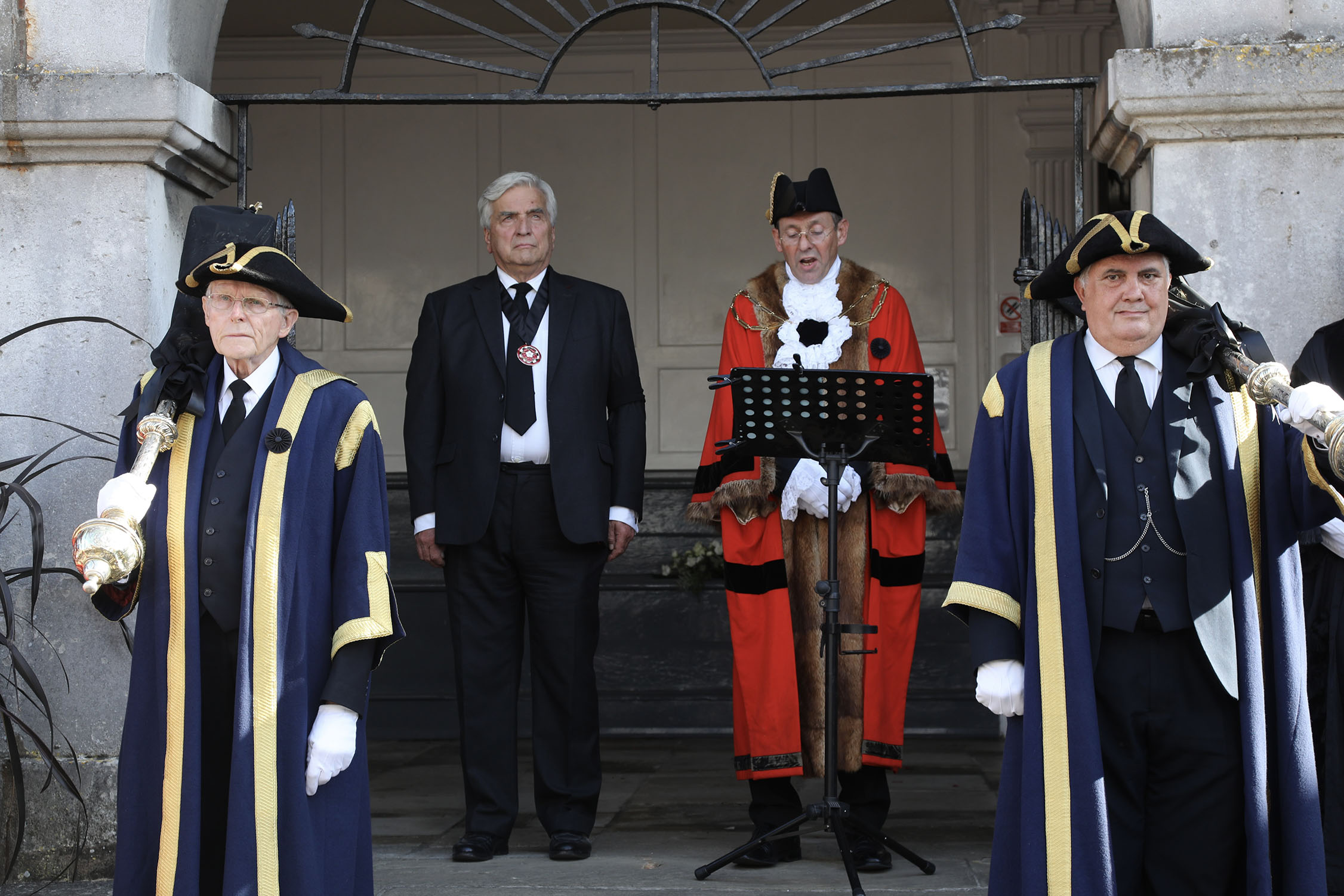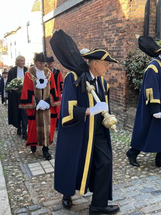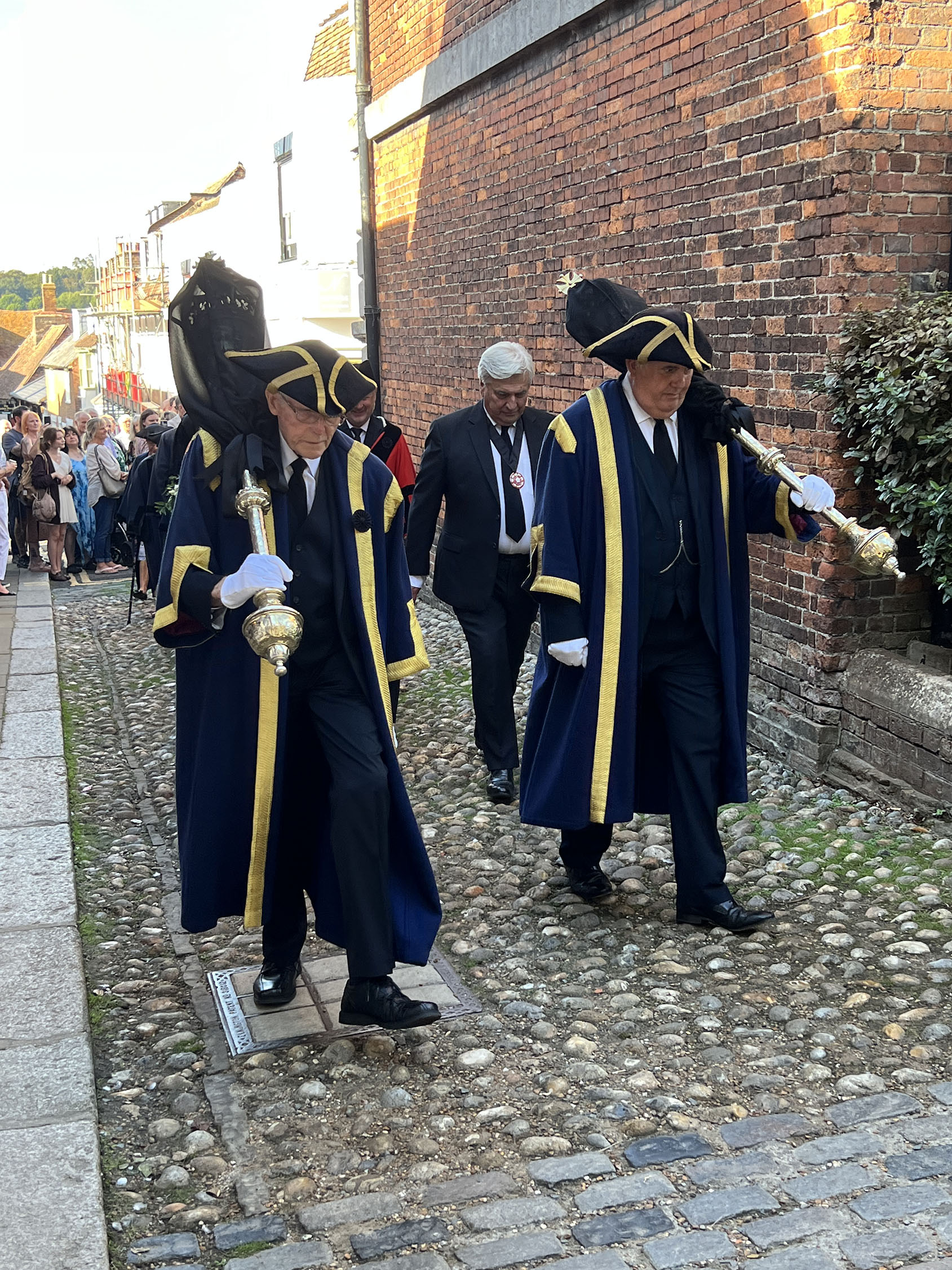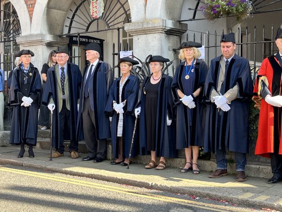 From the steps of the town hall the mayor of Rye, Cllr Andi Rivett read the official proclamation of the accession of HM King Charles III, accompanied by the black- shrouded civic maces and His Majesty’s Deputy Lieutenant for East Sussex, Graham Peters.