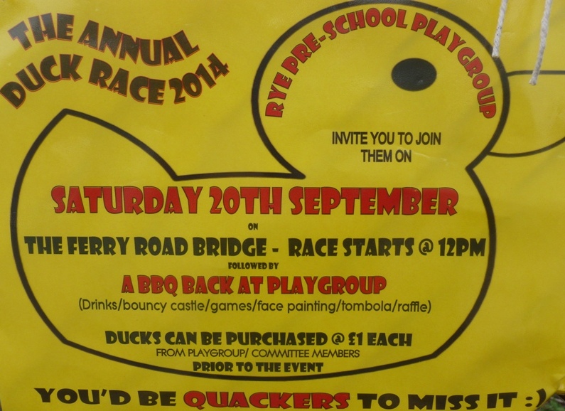 Rye’s Pre-school Play Group will be holding its annual Duck Race on Saturday 20th September at 12 noon at the Ferry Road bridge . . . and you can buy your duck for a £1.
