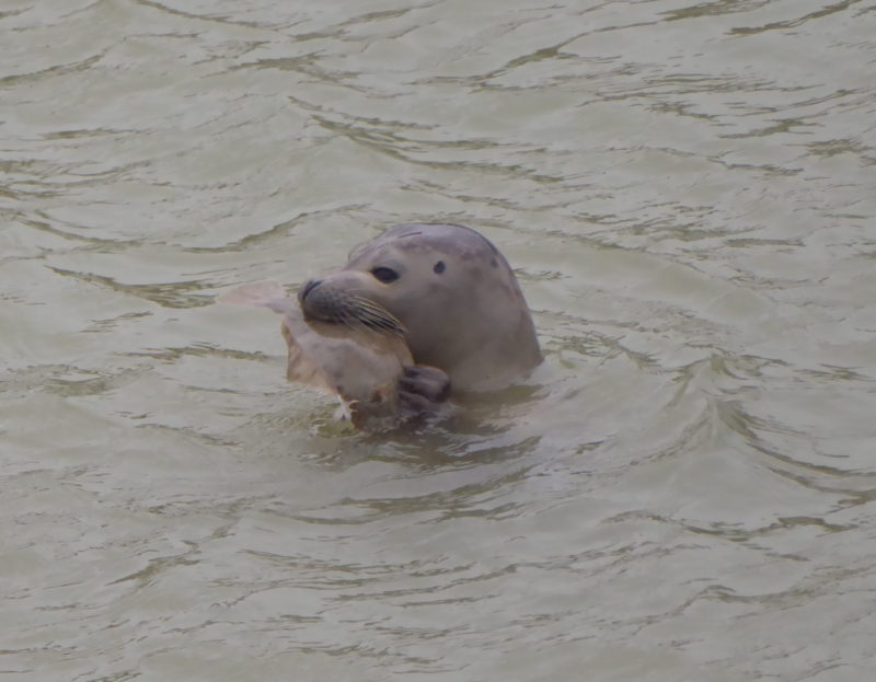A new visitor arrived in town this week and was seen enjoying a fresh fish supper in Rock Channel. Seals have been often seen in the Bay and off the mouth of the river, but, so far as we know, this is the first time one has come so far upstream. Photo by Elizabeth Royle
