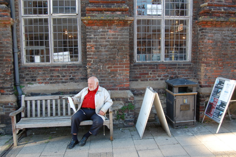 Artist, town councillor and general man about town John Izod, rests outside Grammar School records on his way to Adams to see a man about some printing. But the paper in his hand is a secret – not be revealed until November.