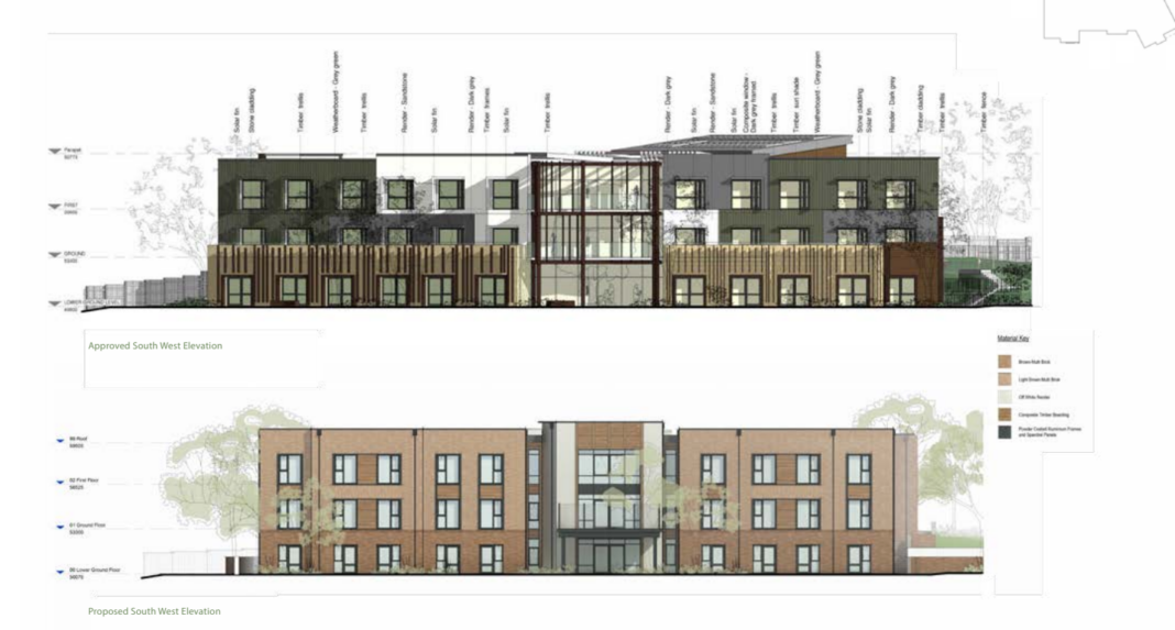 The ambitious original design from 2017 for a dementia care home has given way to a smaller, less elaborate concept, without “landscape-blending” features in favour of a building more in keeping with the brown brick Hub on Rye Hill.