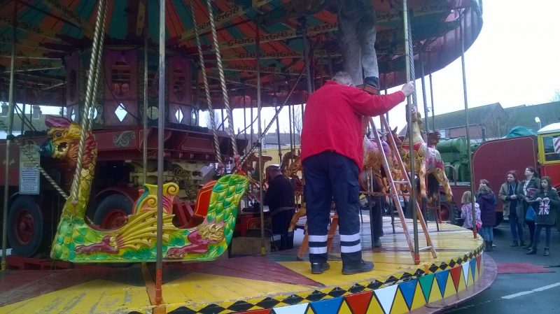 As a volunteer the “Tales of Old” festival organisers on Saturday, December 10, booked me from 9:45am to noon and I duly turned up at the carousel (below left) in the car park behind the Cinque Ports Arms hoping to make myself useful – and the mechanics responsible for the safety of the public were doing the last tests.