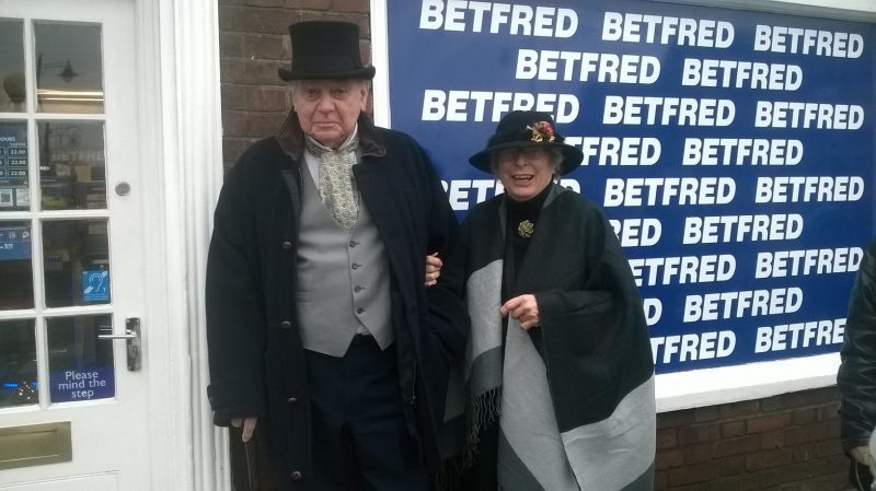 Walking up Conduit Street, I reached the High Street which, at the corner of Adams shop, was rather quiet then – but further along I heard the lovely voices of the Churches Together choir (above, left). Making my way back to Cinque Ports Street I came across the only dressed up people I had seen so far, brilliant, Noel and Kathy Varley (above, right).
