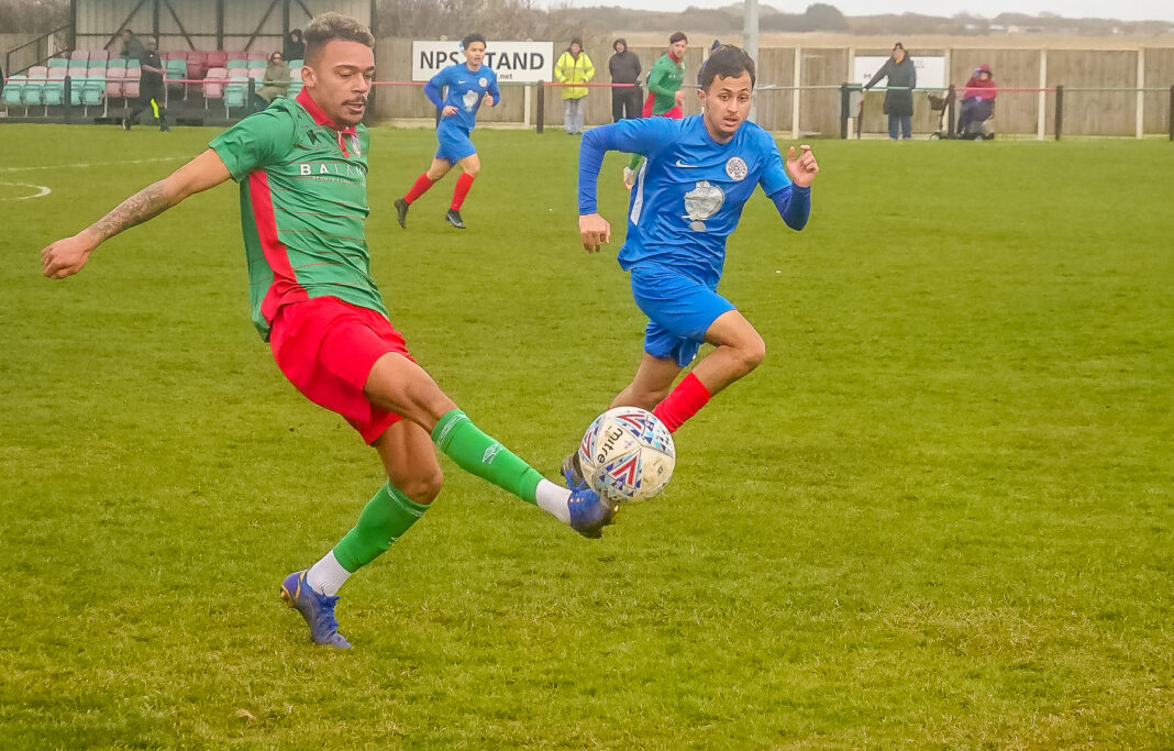 With the wind behind them, the visitors pressed forward but Lydd’s back five of keeper Collins, Hastings, Sedenu, Pogue, and Alexander held together and proved strong enough to frustrate the Bridon attacks.