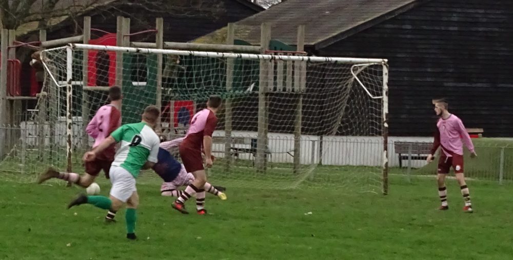Joe Fraser (No. 11 green and white shirt) fires home the third goal