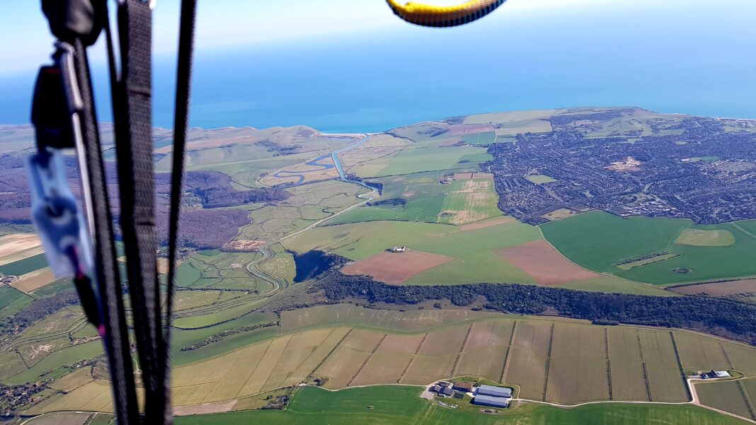 “In still air, paragliders travel at about 15mph. So they travel much more quickly going with the wind (down-wind). In a 15mph wind they travel at 30mph down-wind, but are at a standstill going into wind. So on a typical flying day at Devil’s Dyke the wind will be north-west for take off, and then veer west. So the direction we travel is with the wind to the east, taking us over Lewes, then towards Heathfield or Hailsham, and then over the Weald hopefully in the Ashford direction. But of course if we can’t find rising air (thermal updrafts), then we have to land – hopefully close to civilisation!
