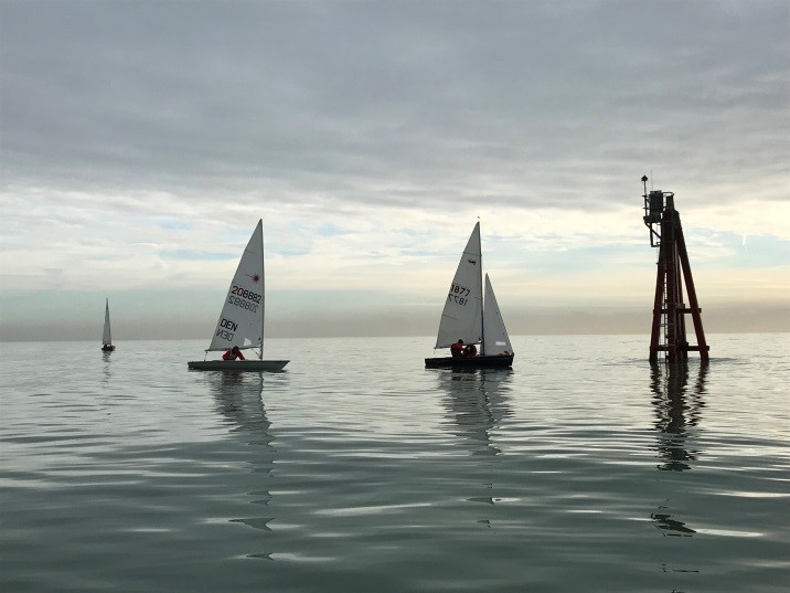 The last race was held on Sunday December 17, a bitterly cold day with sub-zero temperatures but, alas, no wind. The competitors were towed out to Rye Bay, where it was hoped there might be some wind, but once cast adrift for the start, the picturesque sight of the dinghies by the Port marker at the river entrance was something that might inspire Turner to paint, rather than being the prelude to an exciting race.