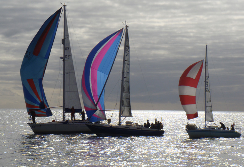The last two races of Rye Harbour Sailing Club’s Autumn Series were contested last weekend October 25-26. On the Saturday, in a very light wind under an overcast sky, nine cruisers competed. With the light wind from the west it seemed to take forever to round the westward mark, in fact one boat didn’t manage to cross the start line! Then on the downwind leg it was all spinnakers as the photograph depicts. Unsurprisingly the smallest and lightest boat, Limbo Girl, won the race.