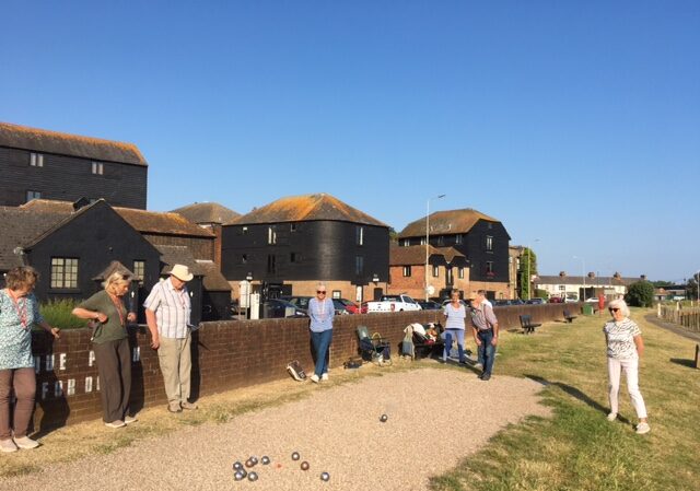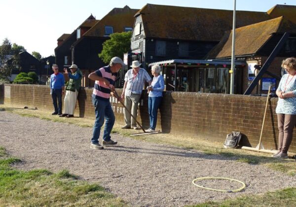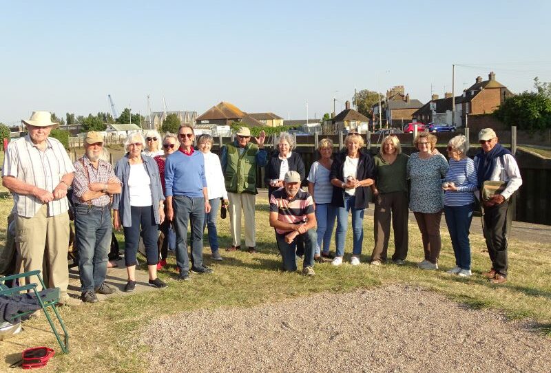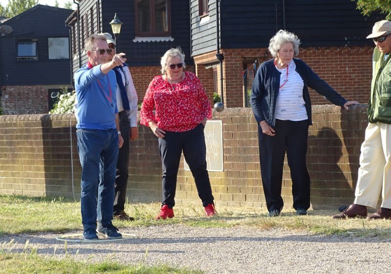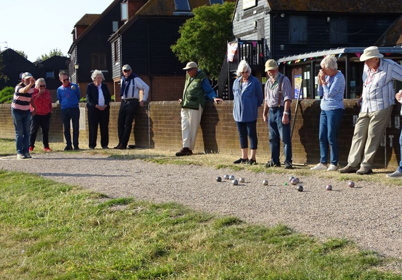 Scoring is similar to lawn bowls and the individual balls nearest to the jack, score the points. The number in the groups is between six and eight, depending who turns up. On Wednesday, June 7, both groups had a competition. It was great fun with much laughter and continued explanations of the rules, even though Ian Scott, chair of Rye u3a, had devised an interesting strategy, so all sixteen players could be in the game. One team won twice but it was all very friendly and finished at Marino’s in the Mint with fish and chips.