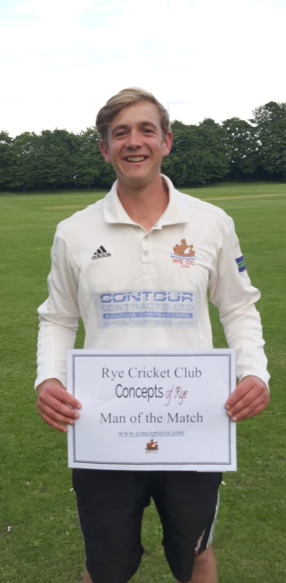 Rye captain Harry Smeed won the toss and choose to bat. This immediately seemed to be the wrong decision as James Hamilton was out to the first ball of the game, but George Wathen (13) joined Rye Concepts MOM Harry Smeed to build a partnership. From this base Harry Smeed leading from the front struck the ball to all parts of the ground to make a brilliant 130 and along with Luke Payton (36) managed to put on 110 for the third wicket and put Rye in a strong position. Mickey Toomey (28*) pushed the score up in the late stages to 247-9, as Rye secured maximum batting points.