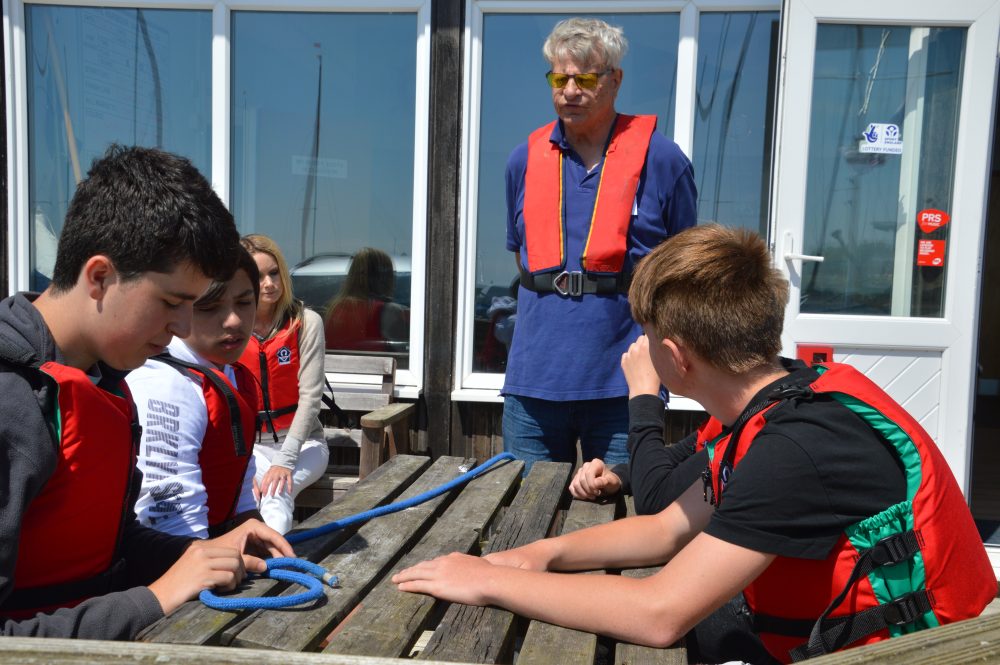 The weather couldn’t have been better with sun shining and a light breeze from the north east, force 2-3. The boats were rigged and while waiting to sail the students were shown how to tie knots, the various points of sail and the different parts of a boat. Before the sail, Mark Whiteman, riverside organiser, briefed the students about the day’s sailing. Skipper Mike Bone with crew Julian Rumball sailed Luey and Anna Knight skippered a club boat. The Rye Harbour Sailing Club (RHSC) rescue boat was helmed by David Whiteman with crew Tony McKenna.