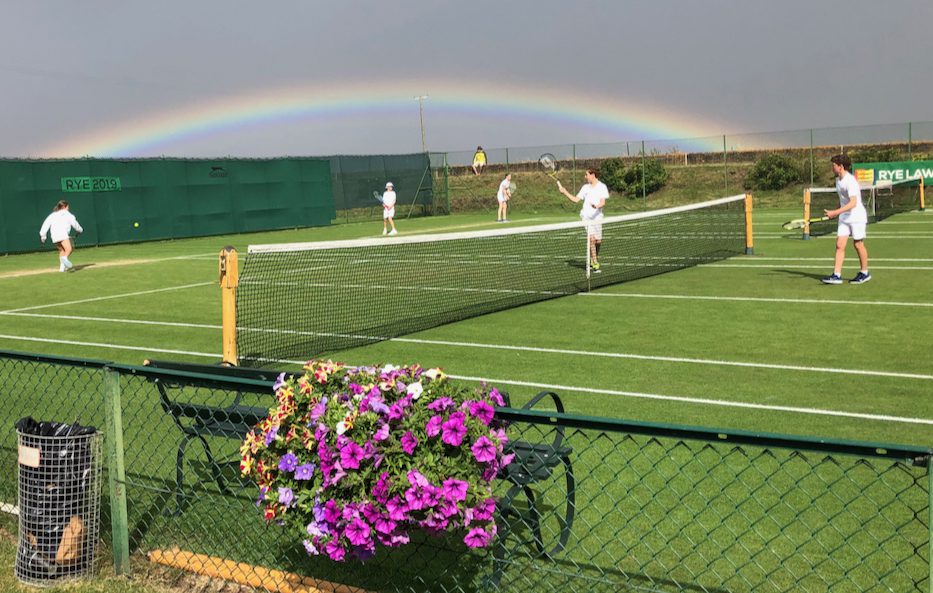 Friday saw the weather turn from sunshine to blustery rain, with the tournament referee Catty Bingham forced to postpone the mixed doubles until lunchtime. Playing through a brief shower in the late afternoon, which brought a superb rainbow over the courts, Freddie Whitfield once again made his way to the final, ably supported by Honor Gibbs. There they met locals Alexandra Erith, from Beckley, and Lorie Reeves, from Benenden, who put on a powerful display to defeat the younger pair.