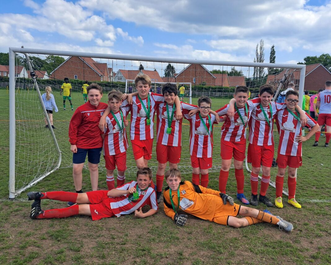 Westfield scored their next then Ashton Casey stepped forward and calmly put it in the corner, so 1-1 then Westfield hit the post with the third so it was down to our keeper to win us the tournament (no pressure!) and he does, firing the ball straight past the Westfield keeper. The boys and crowd who had stayed to watch and support went absolutely crazy! This was a massive achievement for Rye Bay whites u12s and as coaches we couldn’t have asked for more from these players but there’s no time to rest as we’re back in action on Sunday at South Ashford.