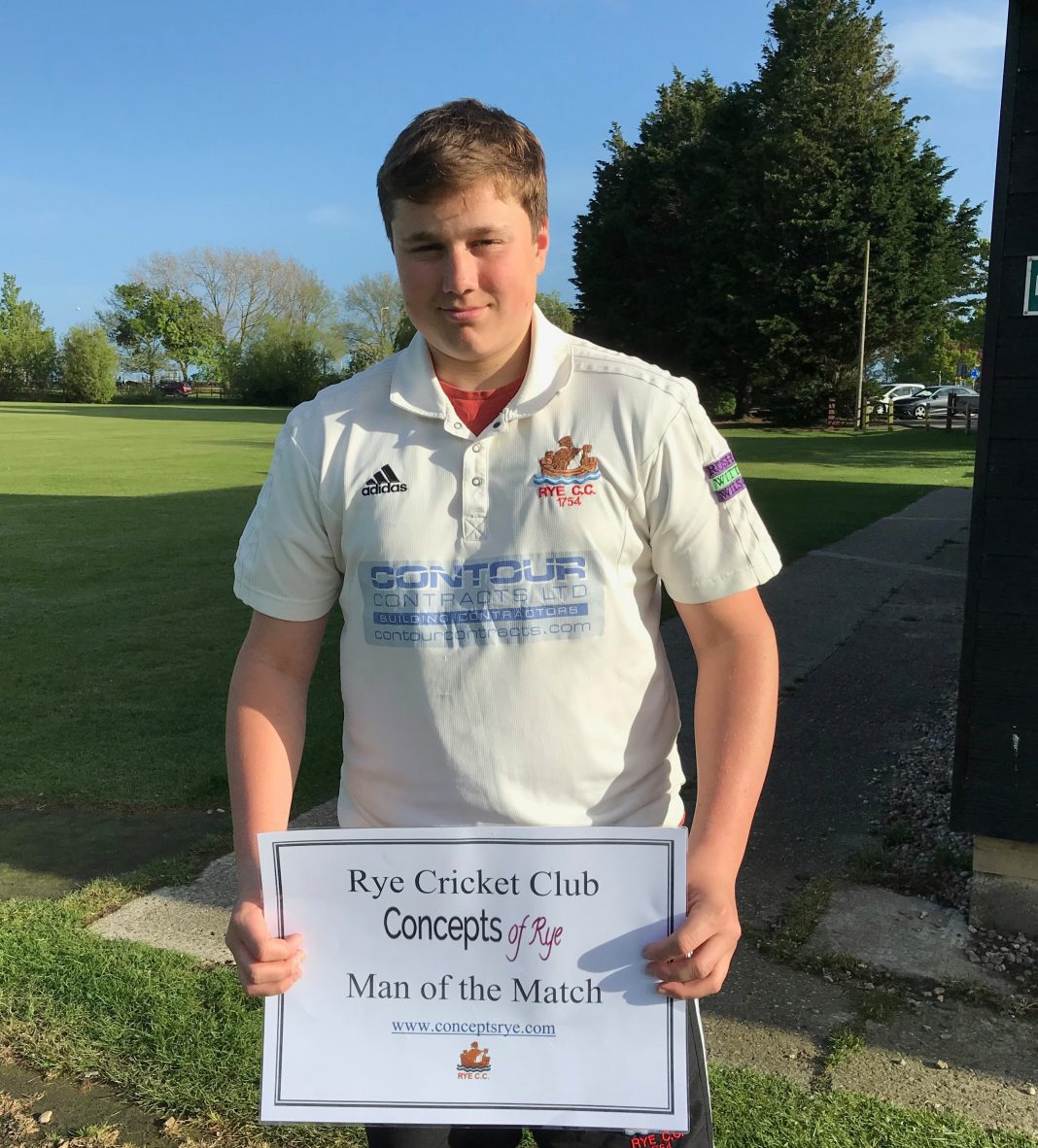 Rye got off to an awful start losing two wickets in the first over, and when Harry Smeed fell for 10, the score read 12-3, but Rye Concepts man of the match Luke Payton (59) and Seabrook (10) built a good partnership and aided by some later order runs from Tobias Farrow (24) pushed the score up to 165 which Rye thought offered a chance with the wicket offering a great deal of assistance to the bowlers.