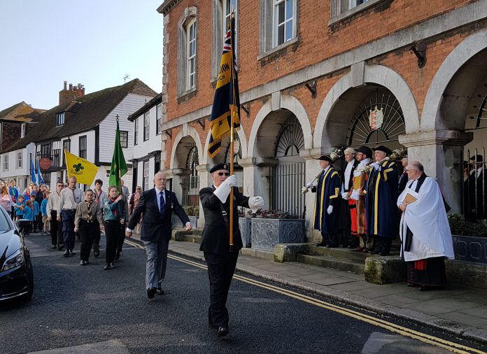 On a bright sunny St George’s Day in Rye, the Mayor, Councillor Jonathan Breeds, took the salute of ex-Service and youth organisations in front of the Town Hall. In Church, Canon David Frost spoke about the significance of flags as a form of identity; As President of Rye Royal British Legion, I spoke to the Scouts and Guides of the origins of the movement and the link to St George, and then led the renewal of their promises. Visitors who joined the service remarked that it was so good to see the St George tradition maintained.