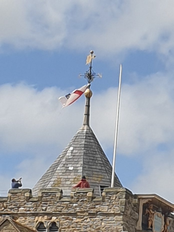 Valiant attempts are made to free the St.George flag from its entanglement with the church weathercock on St Mary’s in Rye following “a fresh breeze” (according to the BBC) on Sunday.